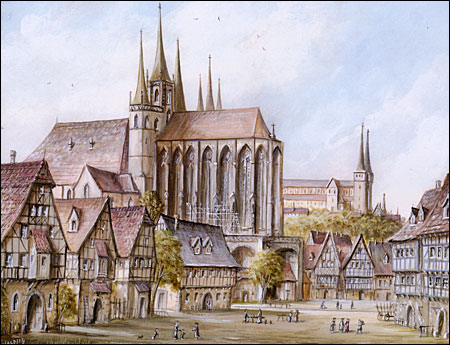 | "Erinnerungen an das alte Erfurt" ist der 15. Kunst-Kalender aus dem Heimatverlag Valdeig betitelt.Er ist für das Jahr 2006 und zeigt Ansichten der Stadt vom Mittelalter bis ins 20. Jahrhundert. Das Bild oben zeigt das Kalenderblatt vom November: Mariendom und Peterskirche um 1500. Der Kalender ist handsigniert und in der Kunsthandlung Valdeig in der Kettenstraße, in der Tourist-Information am Benediktsplatz sowie in den Buchläden der Stadt zu erwerben. |