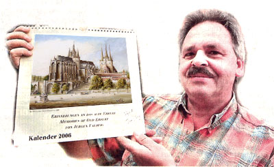| Der Heimatmaler Jürgen Valdeig hat bereits seinen 15. Erfurt-Kalender aufgelegt. Er zeigt für das Jahr 2006 auf zwölf Blättern historisierende Ansichten beliebter Erfurter Plätze und Bauten, etwa die Augustinerkirche um 1850 oder den Petersberg um 1500. TA-Foto:J. König |